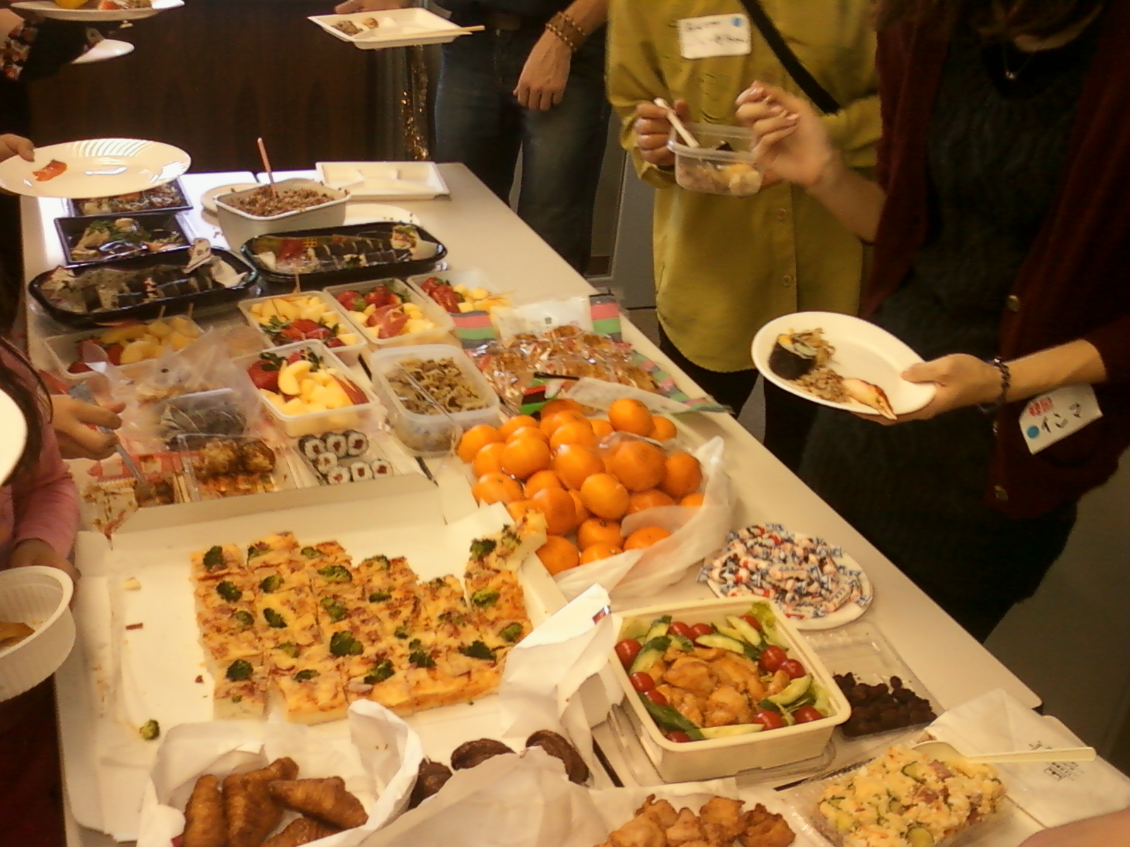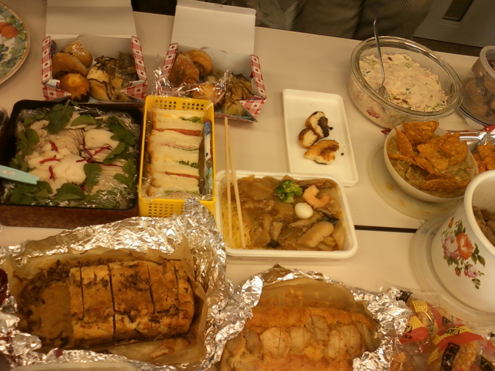 以下是大家把自己带来的或者自己做的食物放到一起,一起品尝的照片。